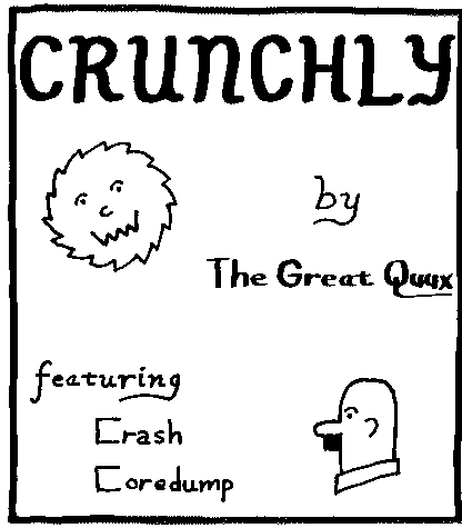 The infamous Crunchly cartoons by The Great Quux are woven into the lexicon, each next to an appropriate entry. To read them in the sequence in which they were written, chase pointers from here using the ‘next cartoon’ information in the captions. A few don't have next pointers; these are vignettes from the 1973 Crunchland tableau spread that inaugurated the strip.